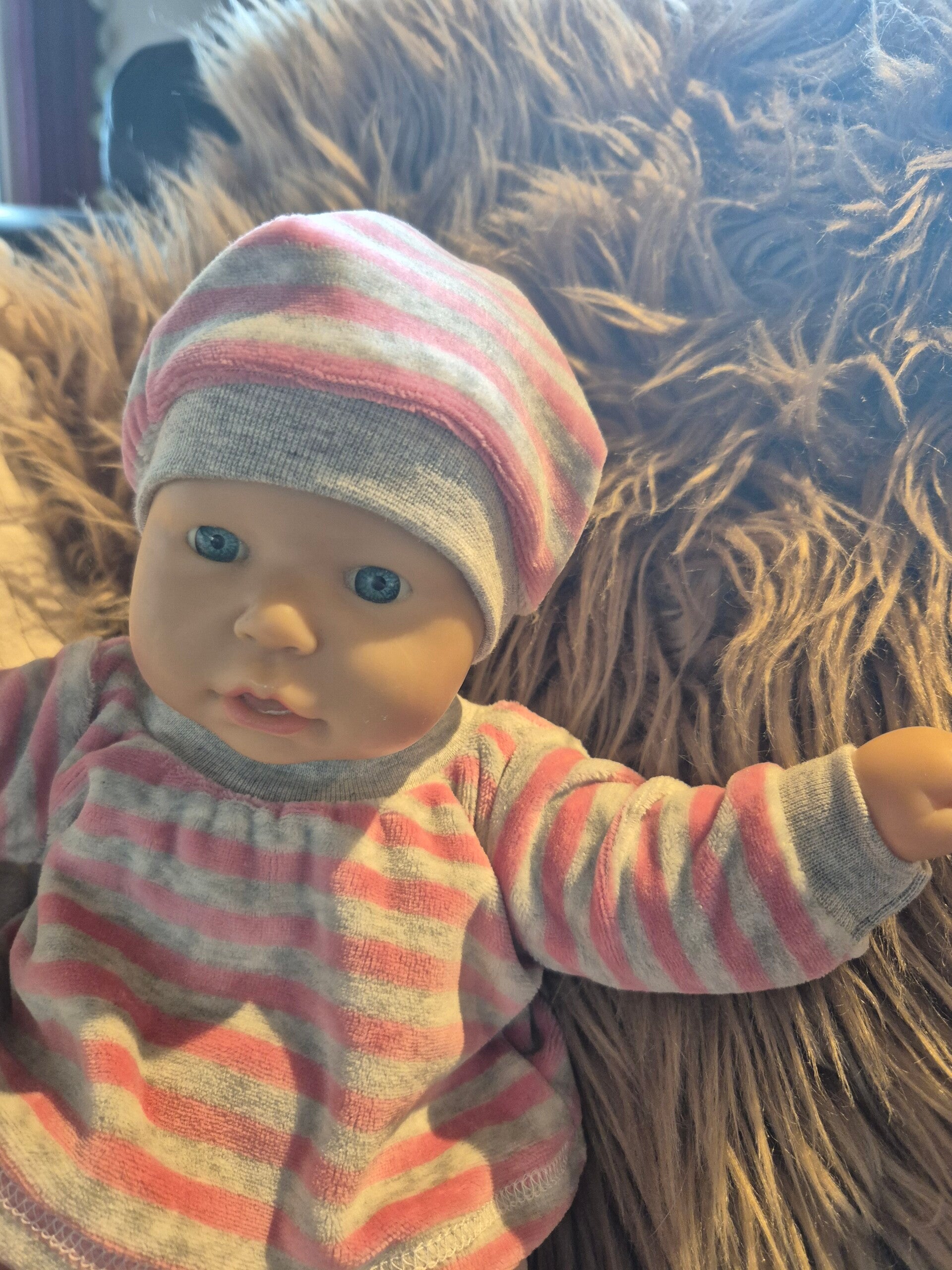 Mütze und Pullover im Streifenlook.
