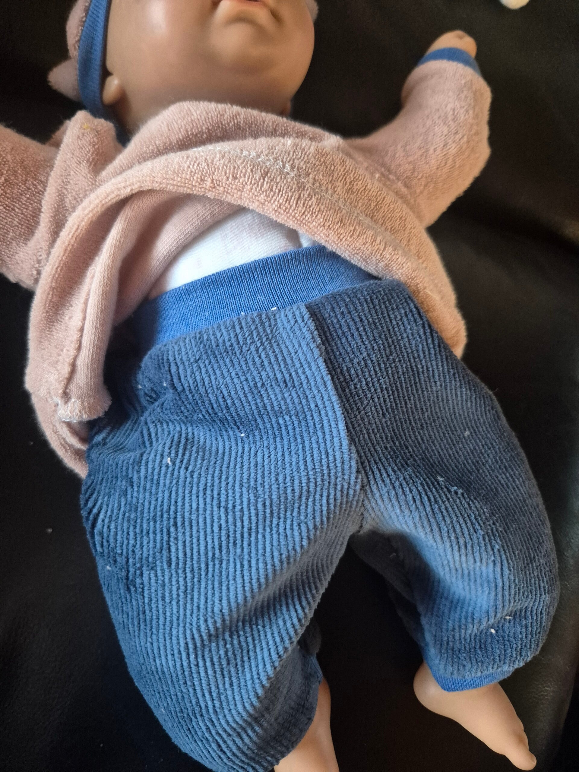 Hose aus Feincordstretch, Pullover und Mütze aus Plüsch.