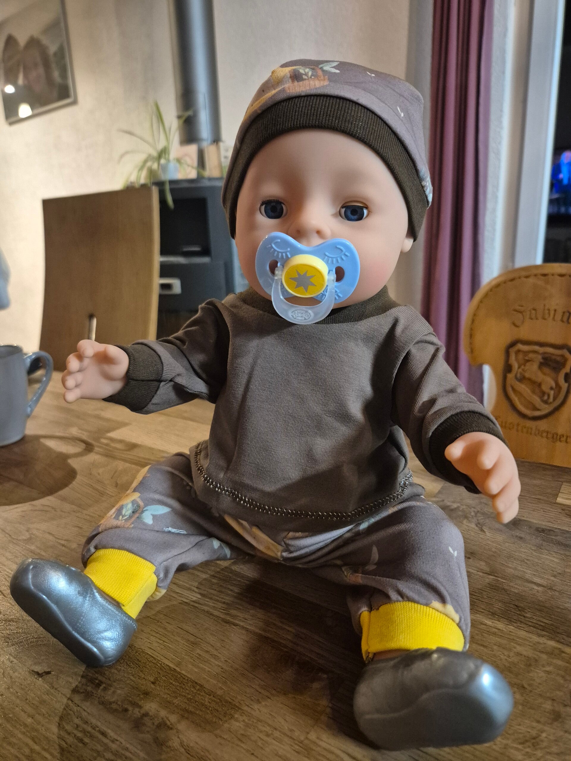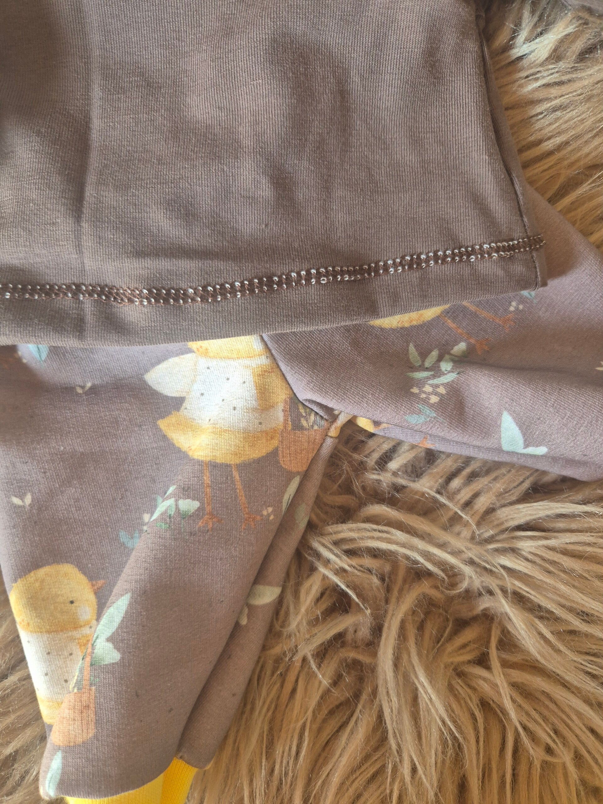 Herziger Dreiteiler bestehend aus Hose, Pullover und Mütze im Osterdesign.